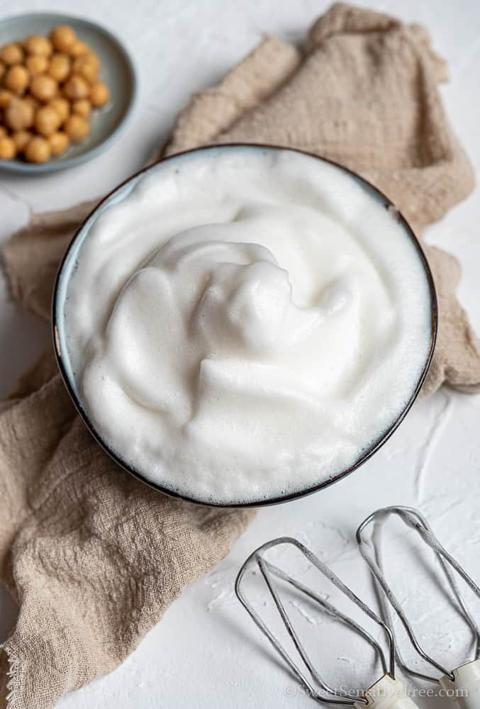 A aquafaba (água da lata ou do cozimento de grão de bico) é um milagroso Substituto de Ovo vegano. Devido às suas proteínas e amidos, ela pode ser batida em picos firmes, assim como claras de ovos, sendo ideal para merengues e mousses. Equivalência Vegan: